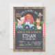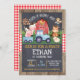 This boy's cute barnyard or farmyard birthday party invitation features a red barn, blue tractor, pig, horse and a cow. The background features a wood and chalkboard image as well as a red plaid pattern sash. This is a cute farm birthday invitation and sweet way to invite your little one's guests to his farm themed birthday party.