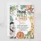 Cute boys safari or wild themed third birthday invitation featuring six cute jungle animals. The back of this young , wild and three birthday invitation features a cheetah print pattern.