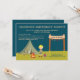 This 5x7 boys birthday party invite has a cute camping theme. It features a blonde haired boy standing next to a campfire with his sleeping bag at his feet. In the background, there is a green tent with a lantern, a hot dog on a stick, and a marshmallow on a stick at the front. On the right, there is a banner with the name of the birthday boy that you can easily personalise. At the top and left, you can customise all of the birthday party information. © 2012 Jessica Weible/JW Illustrations