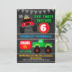 Colorful monster trucks themed birthday invitation featuring red and green trucks and bunting flag on a chalkboard background. This invitation is a colorful way to invite guests to your little boy's birthday party.