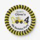 Bold construction building themed birthday personalised disposable paper plates. Digger and chevron design. Personalise with your own birthday boys name and age. Currently reads Dig in it's Oliver's 4th Birthday Party. Ideal for kids construction birthday party's to encourage the children to eat. Original art and design by Sarah Trett.