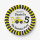 Bold construction building themed birthday personalised disposable paper plates. Digger and chevron design. Personalise with your own birthday boys name and age. Currently reads Dig in it's Daniel's 5th Birthday Party. Ideal for kids construction birthday party's to encourage the children to eat. Original art and design by Sarah Trett.