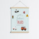This cute blue boys birthday welcome sign features a fire engine truck, police car, and ambulance cartoon, and can be personalised with your child’s name and age. The perfect transport-themed decor for your toddler's birthday event.