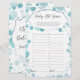 This baby shower game card features a script modern font on aqua blue faux foil dots background, perfect for a baby boy shower.