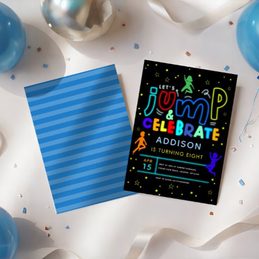 Jump and celebrate with this colourful neon boys’ birthday invitation! Featuring bold text, bouncing silhouettes, and fun star accents — perfect for a trampoline or jump party. Set as an 8th birthday invite but fully customisable.