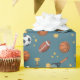 This cool and modern sports-themed kids birthday wrapping paper design features a blue sports pattern, with a basketball, football, soccer ball, tennis racket, trophy, and stars. The perfect sports-themed wrapping for your kids birthday.