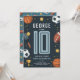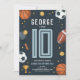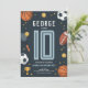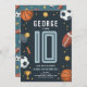 This cute and modern sports-themed kids birthday invitation design features a blue sports cartoon design, with a basketball, football, soccer ball, tennis racket, trophy, and stars. The invite can be personalised with your boys name and other details necessary for your party. The perfect sports-themed addition to your child's birthday party. This invitation is set for a 10th birthday, but this is easy to edit under 'personalise this template' for a different birthday!