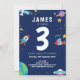This cute and modern Space-themed kids birthday invitation design features a navy space cartoon design, with a rocket, UFO, earth, satelite, astronaut and stars. The invite can be personalised with your boys name and other details necessary for your party. The perfect Space-themed addition to your child's birthday party. This invitation is set for a 3rd birthday, but this is easy to edit under 'personalise this template' for a different birthday!