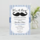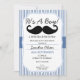 This little gentleman baby shower invitation features black mustache. The design also includes a decorative white frame, some dividers and a blue sash across the middle. The background is a blue and white striped pattern. This boy's baby shower invitation is ideal for a little gentleman baby shower and is ready to be personalized.