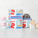 Birthday wrapping paper featuring little wooden boat with sail and flag on a windy day at sea in blue and red with stripes and a anchor. Personalise this whimsical boys birthday paper with your name and age. Currently reads Jamie 2 today. Uniquely painted in watercolor and designed by Sarah Trett.