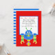 Colourful cartoon robot birthday party invitation with graphics of a blue, green, and yellow cartoon robot on a red and white background. A blue and white striped pattern decorates the back of the invitation. Customise the text for your child's birthday party.