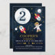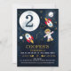 This cute space themed boy's birthday invitation features a large moon some rocket ships, astronaut, planets and faux gold glitter stars and constellations. This design is a cute way to invite guests to a space themed boy's birthday party.
