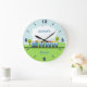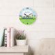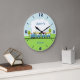 This boys wall clock features a cute teddy driving a blue, yellow and red train in a country setting. It's ready to be personalised and is suitable for a little boy's nursery or bedroom.