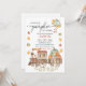 Sweet pumpkin themed second birthday invitation for a little boy featuring a porcupine driven train and some orange and blue pumpkins. The design also includes some autumn leaves, a few flowers and a calligraphy heading.