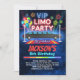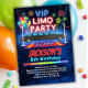 VIP limo birthday party invitation for boys and girls with bright rainbow colours and stars.