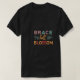 A vibrant t-shirt design featuring the words "Brace, Bolt, Blossom" in a bold, multicolored font. Each word is a distinct colour, creating a visually striking and energetic look.
