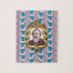 The original illustration by ZoeSPEAK on this music lover's puzzle features a portrait of the classical music composer Johannes Brahms, in an ornate frame of golden ribbons, on a light blue wallpaper background with pink stripes and prancing white sheep. The design is a reference to Brahms's Lullaby, for counting sheep.