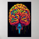 A colourful psychedelic brain in the dark, in the style of caricature illustrations, realistic hyper-detail, simple, colourful illustrations, human anatomy, psychological illustrations, bold lines, bright colours.