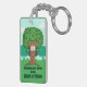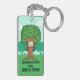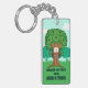 Branch Out With Love and Hug A Tree key chain, featuring a nature inspired scene of a funny happy tree with big goofy eyes and a wide friendly grin. The tree trunk is brown and the leaves are green dotted with red heart shaped apples. Below are two text templates in a chunky fun green font with a black stroke. One reading "Branch Out With Love" and the other reading " Hug A Tree" These can be used as they are or you can use the text templates to add your own text. The background is a simple nature scene with trees, grass and clouds. Ideal for tree lovers, nature lovers and a love for the environment.