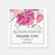Branches with pink rose flowers and typography wedding paper napkin. This sophisticated wedding paper napkin features a beautifully designed branch embellished with soft pink rose flowers and sage green foliage. The names of the couple are elegantly presented in decorative typography, adding a personal touch to the design. Additionally, a heartfelt 'Thank You' message is included. The whole design is surrounded by a delicate thin border that enhances the overall aesthetic.