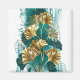 Branch with jewellery, gold and green leaves of Ginko biloba on light, painted green background. Ginko biloba