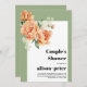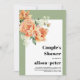 This invitation for the wedding couple's shower showcases a simple white frame, with a delicate branch and peach-coloured roses, lush green leaves, and dainty white baby's breath flowers elegantly placed in the upper left corner. A subtle sage green border gracefully frames three sides of the invitation, adding a touch of sophistication to the overall design. The bold typography used for the text not only enhances readability but also brings a sense of prominence, creating a striking contrast against the soft and muted floral motif.