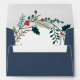 Dark blue envelopes with white cursive text that reads Believe on the outside flap, inside has a branches and berries laurel wreath!
