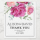 Branches with pink rose flowers and typography wedding wine bottle label. This sophisticated wedding wine bottle label features branches embellished with soft pink rose flowers and sage green leaves. The couple's names are beautifully presented in decorative ypography, adding a personal touch. A heartfelt 'Thank You' note is included, all encased in a delicate thin border that enhances the design's charm.