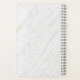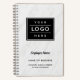 An elegant white marble spiral notebook designed for companies to brand with their own custom logo, employee name, business name, slogan, location, and website. The luxe marble texture paired with a clean framed logo placement and script accents creates a sophisticated promotional gift for staff, clients, or corporate events. All text fields and the uploaded logo are fully customisable.
