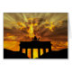 Photograph of the Brandenburg Gate, Brandenburger Tor, or Peace Gate silhouetted by light from the sun breaking through clouds from behind.