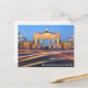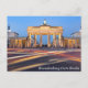 A nighttime photograph of the Brandenburg Gate in Berlin with traffic trails is featured on this postcard.