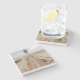 The coasters are gorgeous, a quality feel and heavy weight. They look like a precious archeological find. A rustic stone juxtaposed with a modern floral black and white print. I like the way the print goes slightly imperfect on the cut stone edges giving them a kind-of natural beauty.