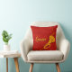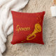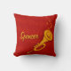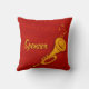 Red and gold stylised brass trumpet musical instrument personalised pillow. Customise with the name of your choice. Currently reads Spencer. A perfect gift for brass instrument players to help keep more comfortable whilst practicing. Would also look great in a music room or in a musical themed kids bedroom.