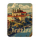 A charming vintage travel advertisement for Bratislava, showcasing the city's rich history and cultural heritage. The design features iconic landmarks, traditional architecture, and picturesque streets, all rendered in a nostalgic, retro style. The artwork evokes a sense of wanderlust and timeless beauty, inviting viewers to explore the enchanting capital of Slovakia.
