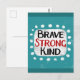 "Brave Strong Kind" is a cute inspirational or motivational quote with a white accent shape surrounded by white textured whimsical dots.