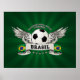 Vintage style poster design for Brazil national team supporter featuring a soccer ball with wings, the Brazilian flag and chant - Nascido para jogar futebol (Born to play football) - and champion stars on radial green background.