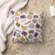 Decorative throw pillow features an original marker illustration of an assortment of breakfast foods including eggs, pancakes, bacon, toast with jam, blueberry muffins, and grapefruit slices.