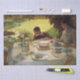 This design features a painting by the Italian artist Giuseppe de Nittis (1846–1884). It shows a family eating breakfast at a formal table in the garden. A woman and young boy are sitting at the table, and there is an empty seat, perhaps where the lady's husband had been sitting. There are ducks and swans walking on the grass in the garden, and the boy is attempting to feed one of the birds with his food. The family is eating from fine porcelain plates and there is white linen on the table. There is also a bouquet of flowers in a vase on the table. The original art was painted by Giuseppe de Nittis in 1883.
