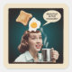 A surreal woman with toast and eggs flying from her head. She holds her coffee cup and asks breakfast in this economy?