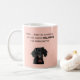 Oh no! A Dachshund's worst fear! This little sausage dog overheard its humans talking about having sausage for breakfast. Black and tan long haired Dachshund with a red name tag over a pink-peach background.