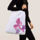 This cross-body tote bag is shown in a breast cancer awareness pink ribbon and butterflies art print.