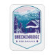 A vintage ski badge design of Breckenridge ski resort with Tenmile Range an extension of the Mosquito Range part of Rocky Mountains during winter in Colorado, United States