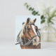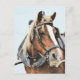 A digital watercolor portrait made from a photo of a French chestnut draught horse with flaxen mane and white blaze, hitched, waiting and ready to go, in harness with a collar, traces and a decorated browband.
