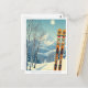 Hello from the snowy mountains of Brian Head, Utah, Iron County, USA! We hope you're having a wonderful ski vacation. This postcard features a gorgeous blue-grey mountain landscape with retro ski boards in an orange tribal pattern.