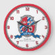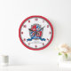 Knights style shield monogram letter B art name simple numbered wall clock in shades of red, blue white and grey. Personalise with your child's own name and name meaning for a personalised touch to your child's bedroom or nursery, this example is for names starting with the letter B. Currently reads Brian A high hill. Noble with great strength. Ideal for a gift to a new baby boy, for a christening, baby naming or baby shower gift. Unique shield drawing, graphic art, name research, wording and design by Sarah Trett. www.sarahtrett.com for www.mylittleeden.com