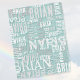 This blanket is not only a source of comfort but also a canvas for a unique and trendy design. The contemporary aesthetic of white and grey fonts, repeated all over the light-teal-blue background, creates a captivating pattern that stretches in all directions, adding a touch of modern elegance to any space.
