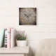 This is a square clock with various glittering hearts all over the aged brick wall.