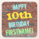 This fun birthday-themed coaster design features a message like "HAPPY 10th BIRTHDAY, FIRSTNAME!", where the name can be personalised. The background features a representation of a brick wall consisting of some reddish-brown coloured bricks. The customisable message text features colours like blue, yellow, and green, and it has an appearance inspired by that of painted graffiti. Coasters like these might be useful as practical decorations at a birthday party for somebody who is celebrating their tenth birthday. [~Z0000288]