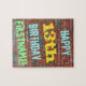 This fun birthday-themed puzzle design features a message like "HAPPY 13th BIRTHDAY, FIRSTNAME!", where the name can be personalised. The background features a representation of a brick wall consisting of some reddish-brown coloured bricks. The customisable message text features colours like blue, yellow, and green, and it has an appearance inspired by that of painted graffiti. A puzzle like this might be used as a fun way to send birthday wishes to somebody who is celebrating their thirteenth birthday, and who perhaps really likes doing puzzles. [~Z0000285]