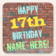 This fun birthday-themed coaster design features a message like "HAPPY 17th BIRTHDAY, NAME-HERE!", where the name can be personalised. The background features a representation of a brick wall consisting of some reddish-brown coloured bricks. The customisable message text features colours like blue, yellow, and green, and it has an appearance inspired by that of painted graffiti. Coasters like these might be useful as practical decorations at a birthday party for somebody who is celebrating their seventeenth birthday. [~Z0000288]